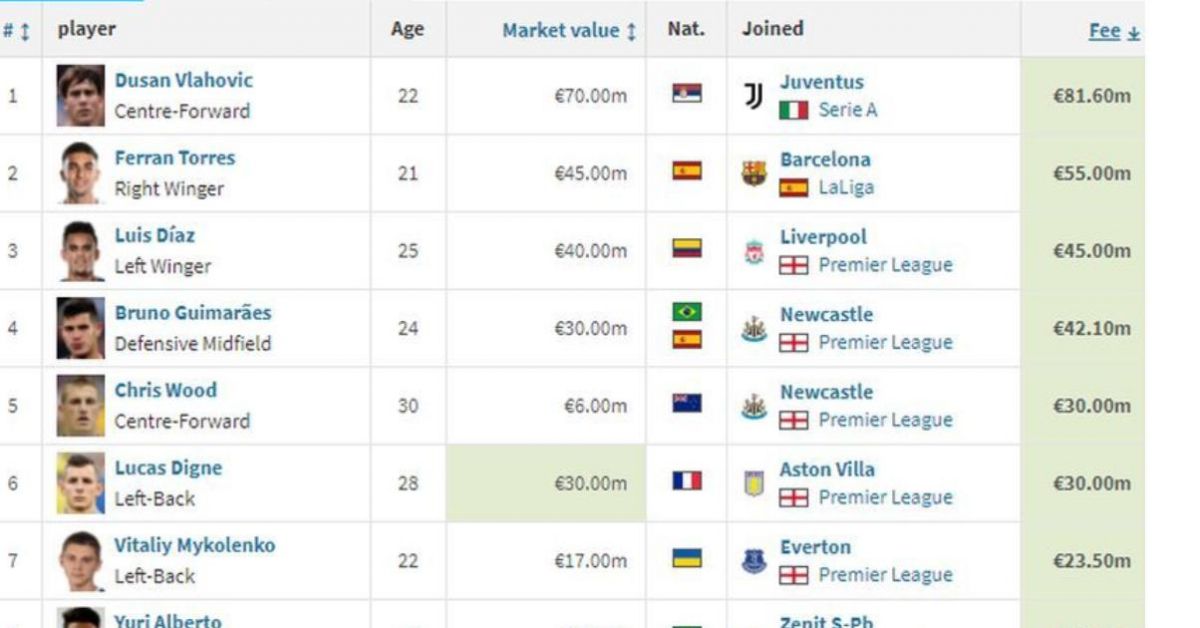 Второто място в списъка на най-скъпите трансфери в този преходен период е заето от Феран Торес, бивше дясно крило на Манчестър Сити и испански национал. Фиксираната сума от 55 милиона евро, които Барселона ще плати на английския клуб на четири вноски, първата от които следващото лято, поставиха трансфера в "Топ 3" на зимата. В договора има и четири клаузи, които могат да увеличат общата сума до 65 милиона евро.