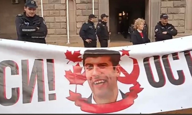 Протестиращите опънаха и транспарант с надпис “Подай си оставката“. На него е изобразено лицето на премиера Кирил Петков, осмян със сърп и чук и герба на Канада..
