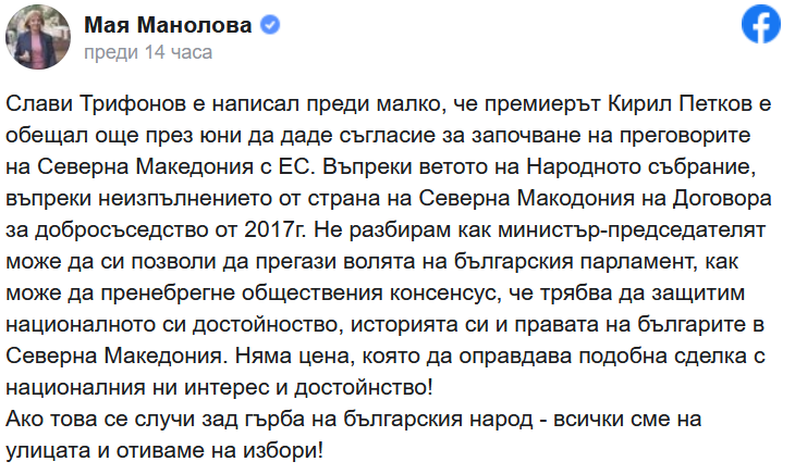 И Мая Манолова заплаши с протести, ако премиерът Кирил Петков зад гърба на народа вдигне ветото на РС Македония.