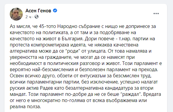 Няма спор - щом и "своите" ги оплюха, провалът на 45-то Народно събрание е безспорно признато. Асен Генов, един от най-отявлените приближени на медиите на Прокопиев и пръв протестър, написа остър коментар на страницата си във Фейсбук. Язвителните думи са "камък в своята градина", тъй като някогашната "дясна ръка" на Христо Иванов-Бойкикев критикува парламента, до който най-сетне се докопаха представителите на ДеБъ.
