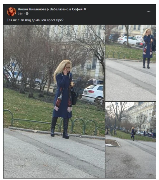 Бившата кметица на столичния район "Младост" Десислава Иванчева нагло нарушава мярката си за неотклонение - домашен арест. Столичани заснеха Иванчева на разходка в центъра на София. Снимките бяха качени във Фейсбук групата "Забелязано в София".