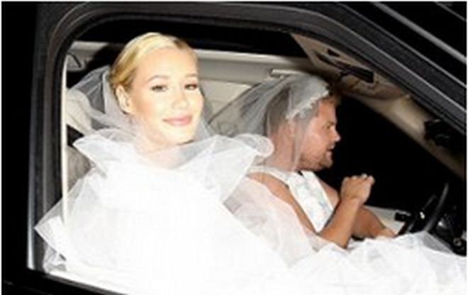 Иги облече бяла рокля, за да се даде на комика и водещ Джеймс Кордън.