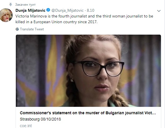 Дуня Мятович - комисар по правата на човека на Съвета на Европа, още не е махнала изявлението, че Виктория Маринова е четвъртият журналист и третата жена журналист, убити в ЕС от 2017 г. насам.