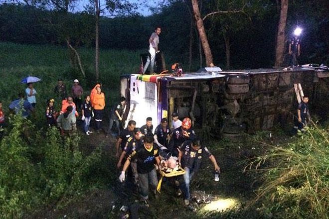Бусът, пътуващ от столицата Банкок за град Краби, се обърнал в крайпътна канавка. Шофьорът загубил контрол над машината при силен дъжд.