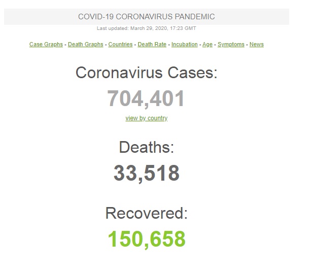 Само за ден - от вчера до днес, новите случаи на заразени с коронавирус в света скочиха със 100 000! Вчера те удариха 600 хиляди, а днес са вече над 700 000! Смъртните случаи за щастие растат по-бавно и днес са 33 518, а вчера бяха малко под 28 хиляди.