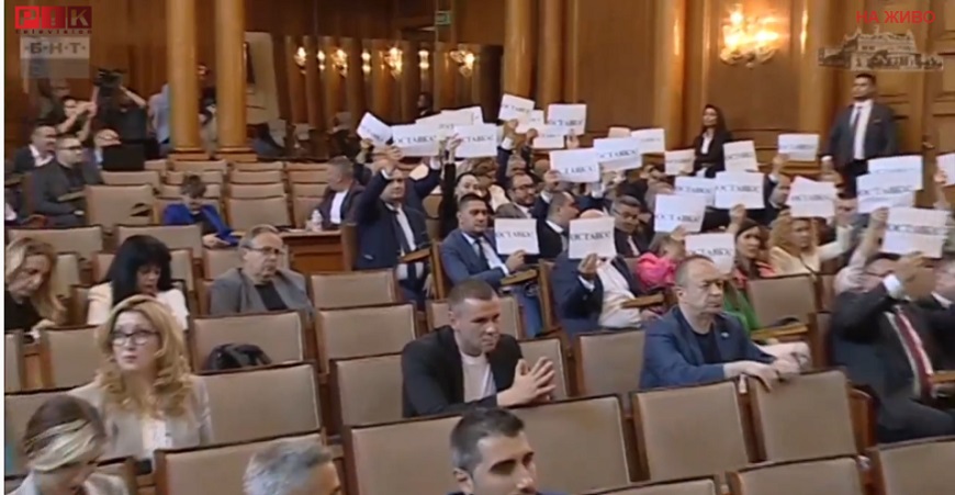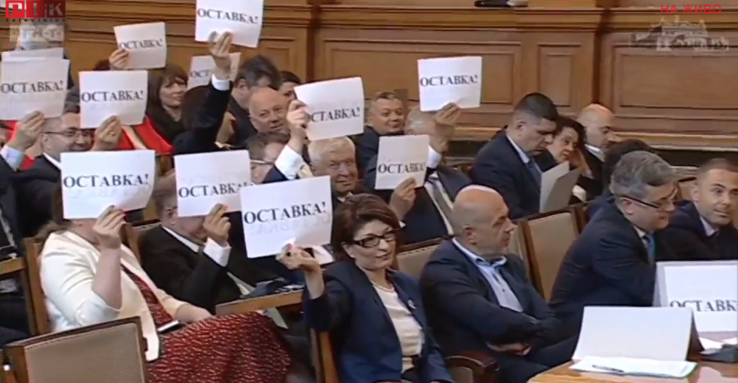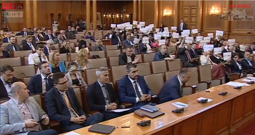 Плакати с надписи "Оставка" издигнаха депутатите от ГЕРБ по време на оправданията на вицепремиера Калина Константинова от парламентарната трибуна за провала с преместването на украинските бежанци.