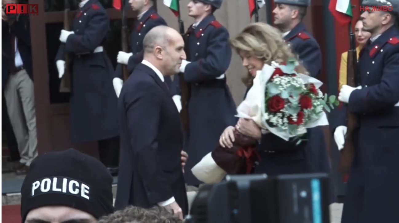 Пред президентството Радев и Йотова размениха няколко думи, а гражданинът Румен й подари букет с цветя.