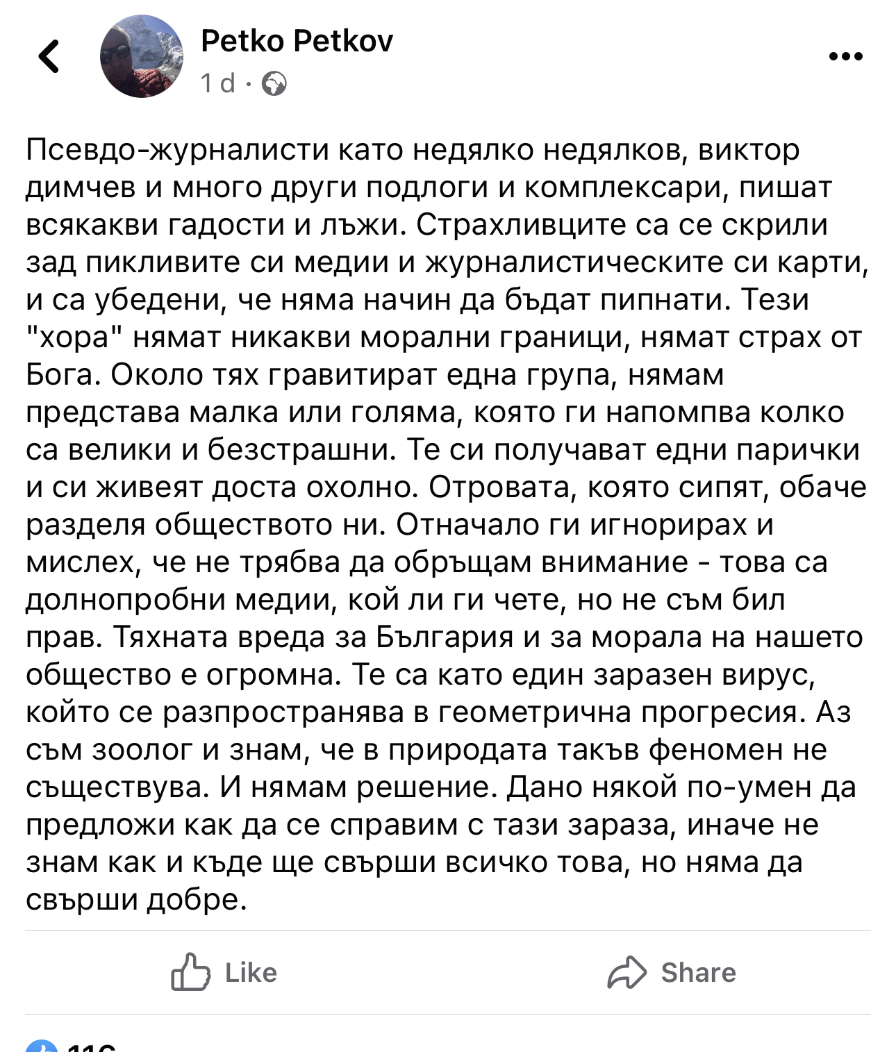 "В статуса си Петков пише, че бил зоолог. Очевидно бърка отношенията си с хората с отношенията си с животните. Печално е, че психически нестабилен мъж като него взима важни решения в българската политика. Петко Петков е част от отровата на действащото българско правителство. А семейство Петкови - баща и син, имат нужда от специализирано лечение", обобщава Недялко Недялков.