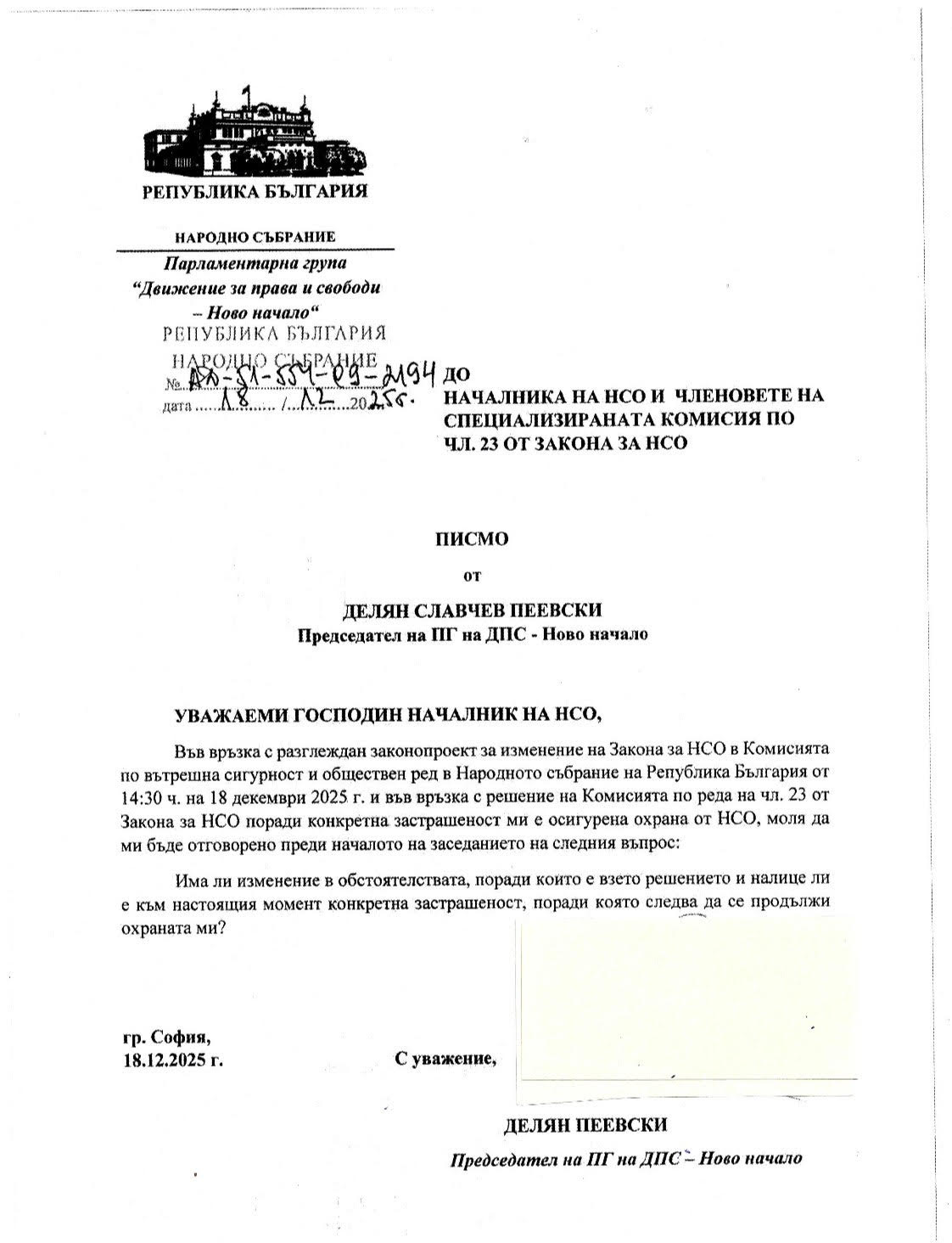 Лидерът на ДПС и ПГ на ДПС-НОВО НАЧАЛО Делян Пеевски изпрати писмо до началника на НСО и Специализираната комисия по чл. 23 от Закона за НСО, с което поиска компетентният орган да се произнесе за това, дали има изменение в обстоятелствата, поради което е взето решението и на лице ли е към настоящия момент конкретна застрашеност, поради която следва да се продължи охраната му.