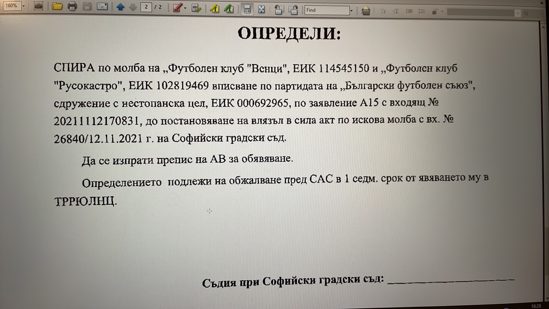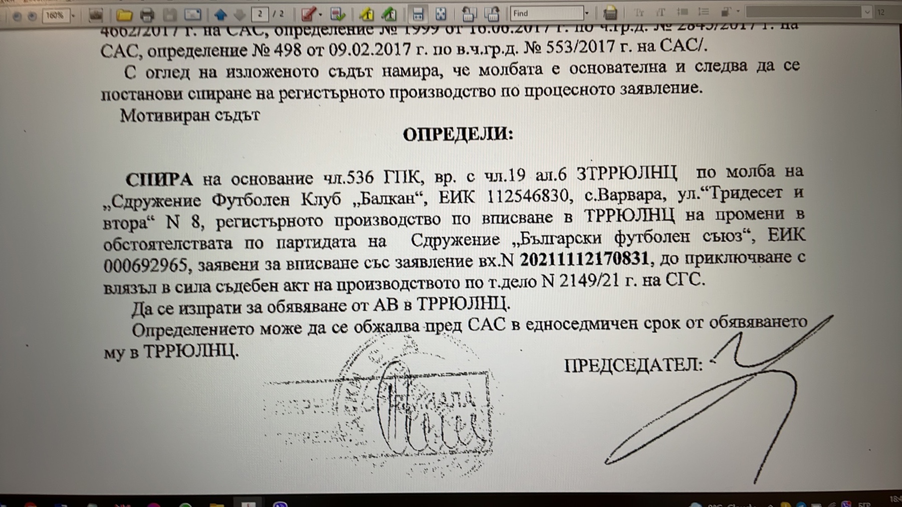 Два състава на Софийския градски съд постановиха спиране на вписването на решенията на конгреса на БФС от 12.10.2021 г. в регистъра на юридическите лица с нестопанска цел, научи ПИК.