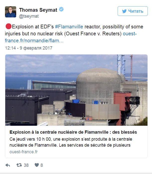 Експлозия избухна в атомната електроцентрала във Фламанвил, Франция, съобщава Rt.com.