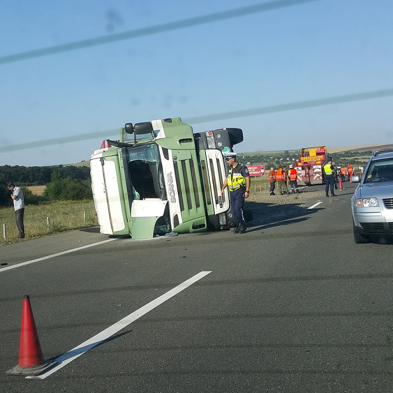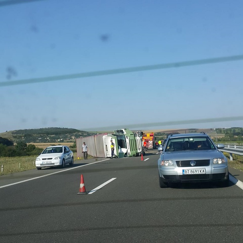 Катастрофата е станала около 6 часа на 312-ия километър в посока Бургас. Камионът се е преобърнал, като е запушил аварийната и активната лента.