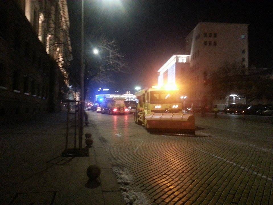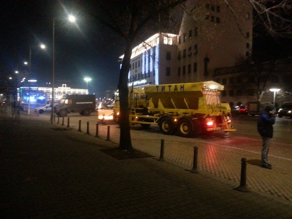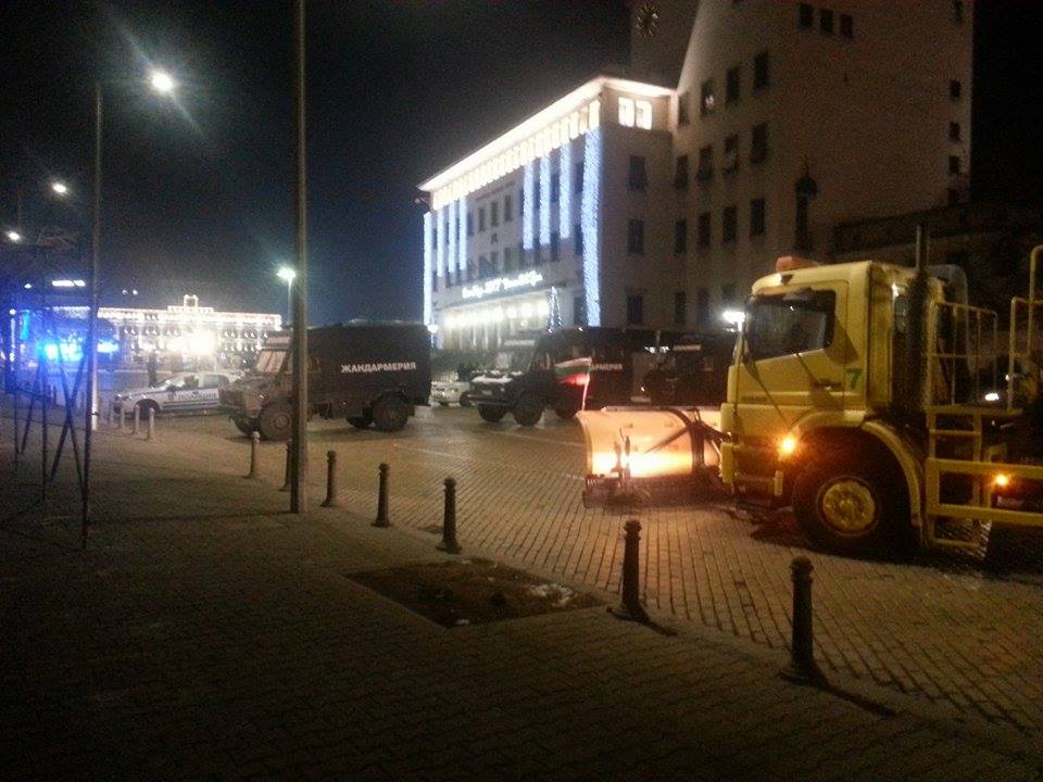 Всички уличи, по които може да се стигне с кола до площада, са блокирани с тежка техника – или машини на жандармерията, или специални коли на фирмите по чистота. Те са разположени така, че да не може да се заобиколят.