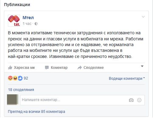 Мобилният оператор "Мтел" съобщи за проблеми в мрежата на официалната си страница в социалната мрежа Фейсбук.