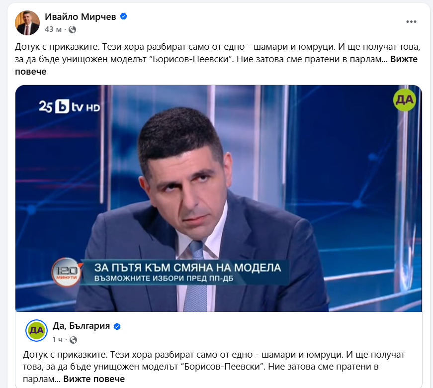 Реакция дойде и от Делян Доблев: "Иво Мирчев щял да решава проблемите на България с шамари и юмруци. Абе вие чувате ли се какво говорите?".