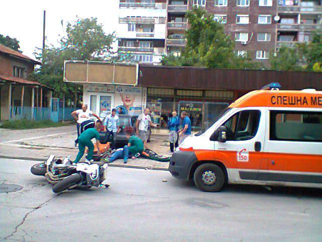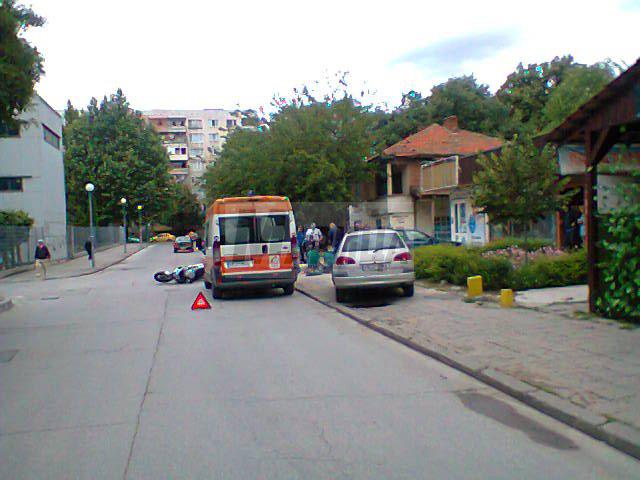 Заради отнето предимство на Т-образното кръстовище на улица "Босилек" и "Ландос" (зад бившия РУМ "Изгрев") син Фолксваген блъсна моториста.