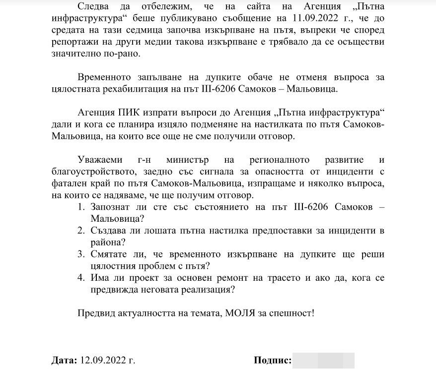 Затова и медията сигнализира премиера Гълъб Донев и министъра на регионалното развитие и благоустройството арх. Иван Шишков. В сигнала си до двамата описваме опасността, която създава пътя Самоков-Мальовица и отправяме своите въпроси към арх. Шишков дали е запзонат със състоянието на трасето и дали има проект за цялостната му рехабилитация.