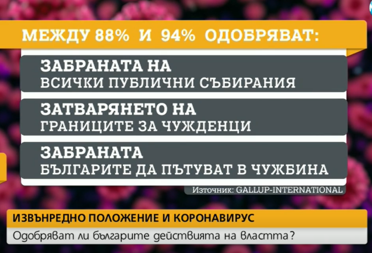„Относно типовете мерки, които са взети, се вижда, че в първите три типа - забрана на всички публичини събития, затваряне на границите за чужденци и забрана на българите да пътуват в чужбина, одобрението е между 88% и 94%“, посочи още той.