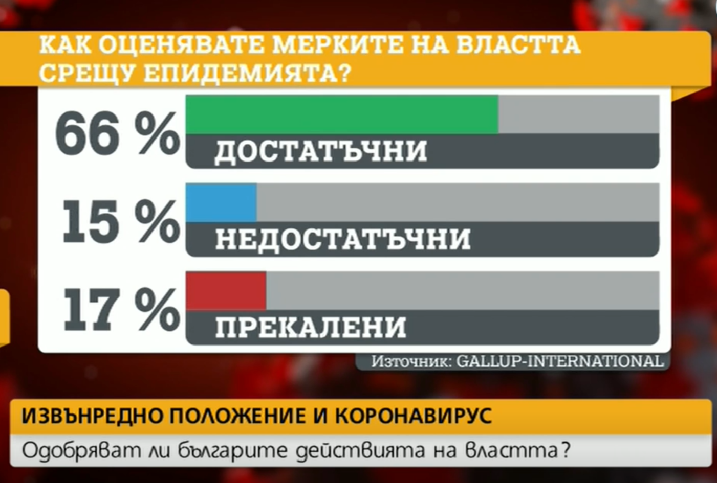 „На въпроса как оценяват мерките на властта срещу епидемията, 66% казват, че са достатъчни; 17% твърдят, че са прекалени, а 15% смятат, че са недостатъчни“. Това обяви социологът от „Галъп интернешънъл“ Светлин Тачев пред Нова телевизия.