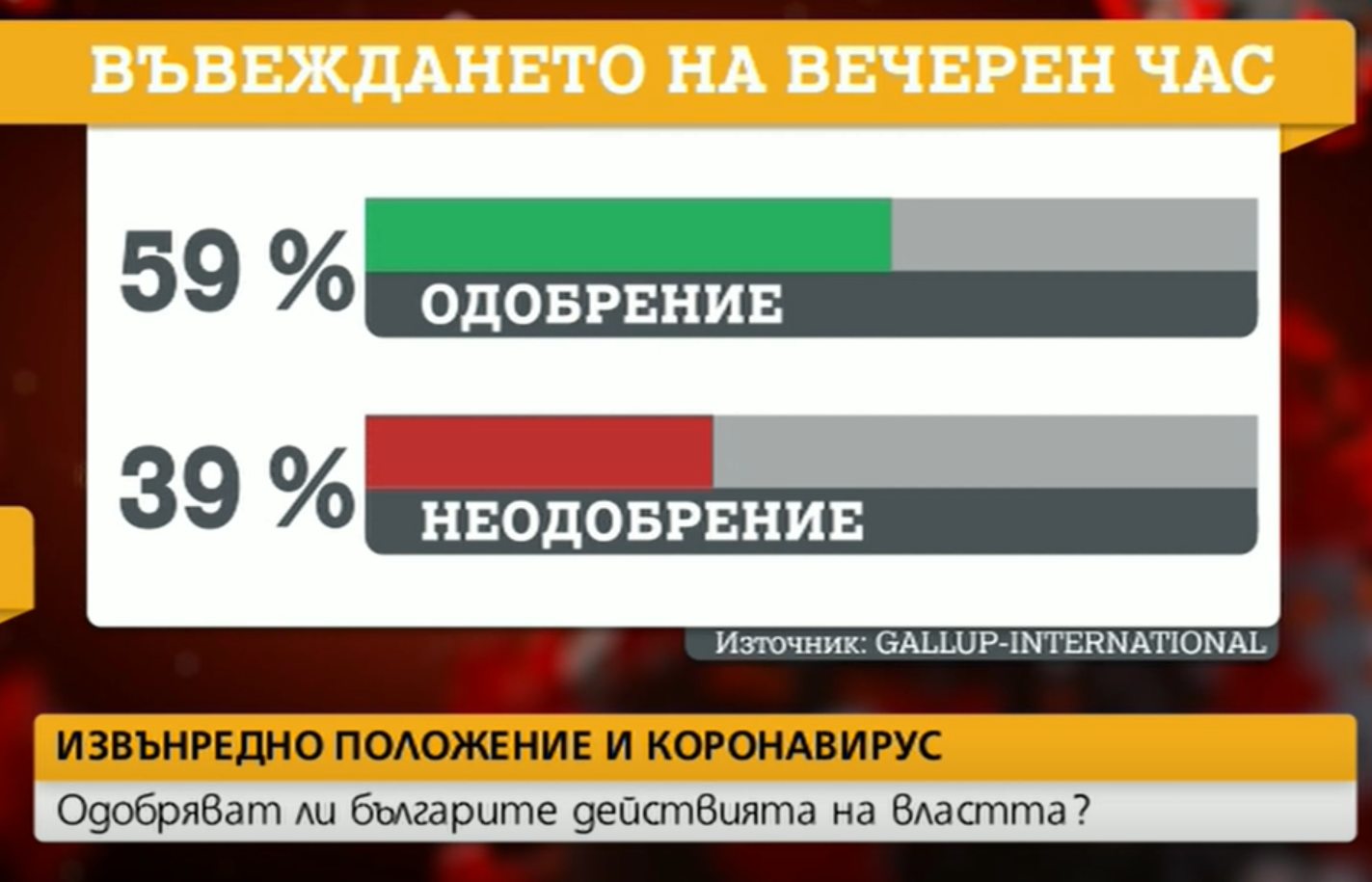 От изследването става ясно, че относно въвеждането на вечерен час и ограниченията за преминаване от един в друг град има разделение на мненията. 56% от анкетираните одобряват забраната да се пътува от град в град, а 59% одобряват въвеждането на вечерен час. „От това става ясно, че българите не са крайни и не приемат крайни мерки. Те са по-скоро умерени“, коменитра още Светлин Тачев.