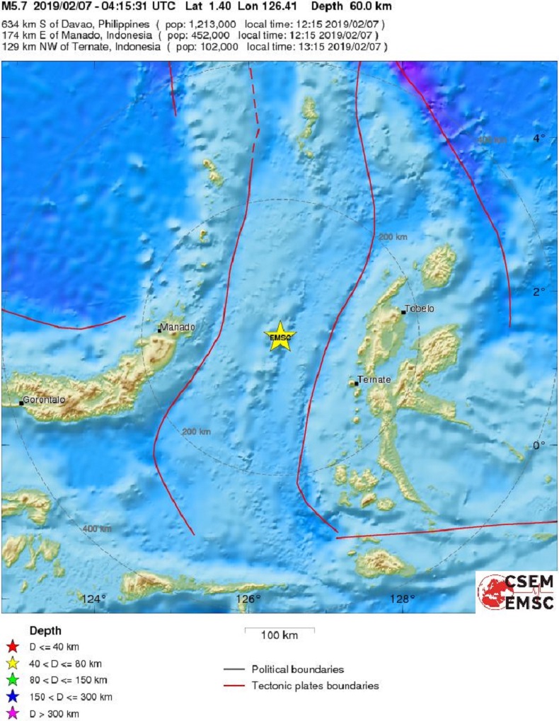 Епицентърът на труса е на 129 км северозападно от град Тернат, а дълбочината е 35 км. До момента няма информация за жертви и разрушения или опасност от цунами.