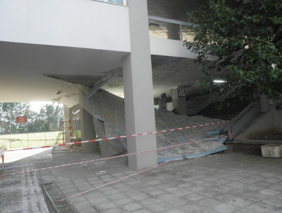 Таванът е паднал върху стълбище, водещо към учебни зали, които се използват рядко. Под падналия таван се минава за стадиона.