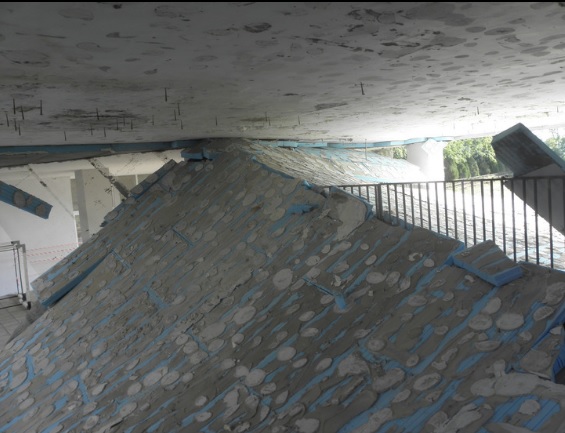 Откъртила се е мазилката ведно с 10-сантиметровата изолация. Падналият таван не е в учебна зала, а в проход под колони, през който се отива към паркинга между Първи учебен корпус и закритата спортна зала.