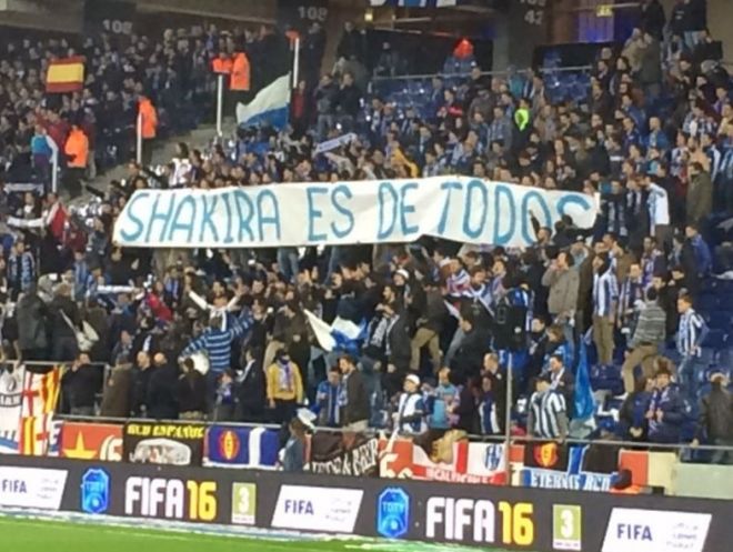 На трибуните също беше горещо. Феновете на Еспаньол опънаха транспарант "Шакира е обща", с който целяха да подразнят защитника на Барселона Жерар Пике, който е съпруг на колумбийската музикална звезда.