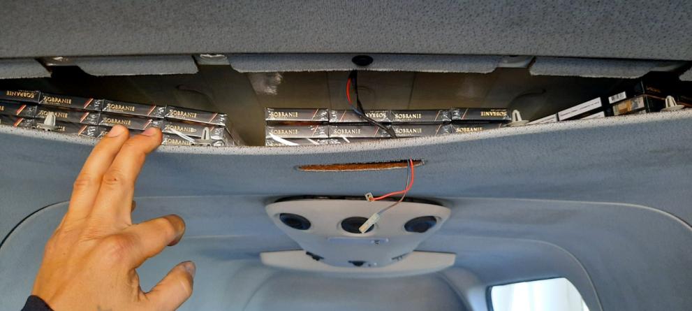 След направена физическа проверка на микробуса инспекторите откриват, че в конструктивните кухини на превозното средство са укрити голямо количество цигари.