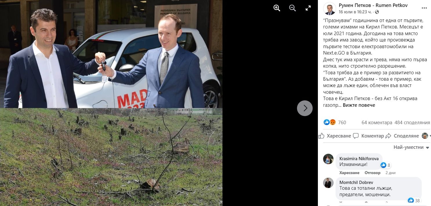 Това е Кирил Петков - без Акт 16 открива газопровод, мами най-безсрамно, че ще се построи завод в определен срок и нищо от това не е вярно…", заяви Петков в своя публикация в социалните мрежи.