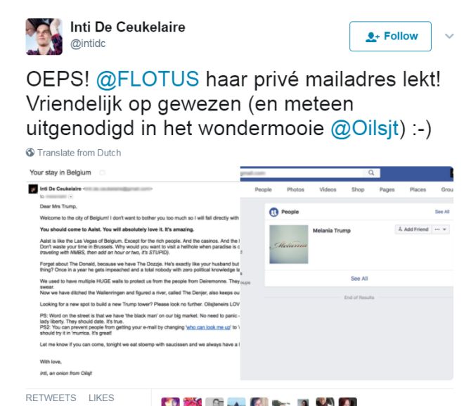 Белгийски хакер с псевдоним Инти де Ceukelaire е разбил настройките за поверителност във фейсбук, намерил е електронната поща на Мелания Тръмп и й изпратил писмо. С което доста открито я съблазнява да зареже американския президент и да промени живота си към по-добро. Дръзкият кибер бандит е споделил  съобщенията си до Първата дама на страницата си в Туитър, разказват от Лайф.ру.