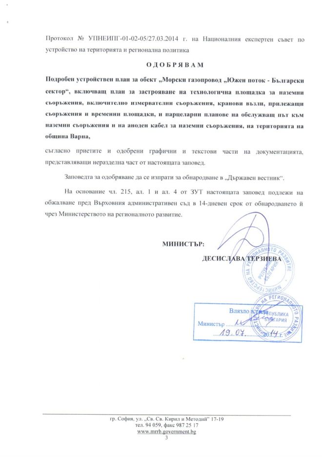 Подробният устройствен план (ПУП) на строителната площадка за компресорна станция на "Южен поток" е бил одобрен от Министерството на регионалното развитие.