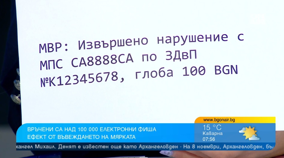 "Този SMS, който получават, съвсем не е да се реализира административно наказателна отговорност, а с информационен характер - цели да извести човека, че има издаден вече съществуващ документ - фиш, електронен фиш за нарушаване на скоростните режими и наказателно постановление", поясни гл. инспектор в отдел "Пътна полиция" Мария Ботева.