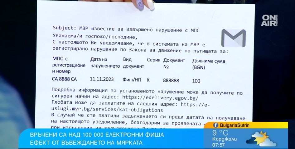 "Електронните фишове за установяване на нарушение на скоростни режими и наказателни постановления първо трябва да бъдат връчени и тогава да бъдат предприети действия по заплащане или обжалване", уточни гостът на Bulgaria ON AIR.