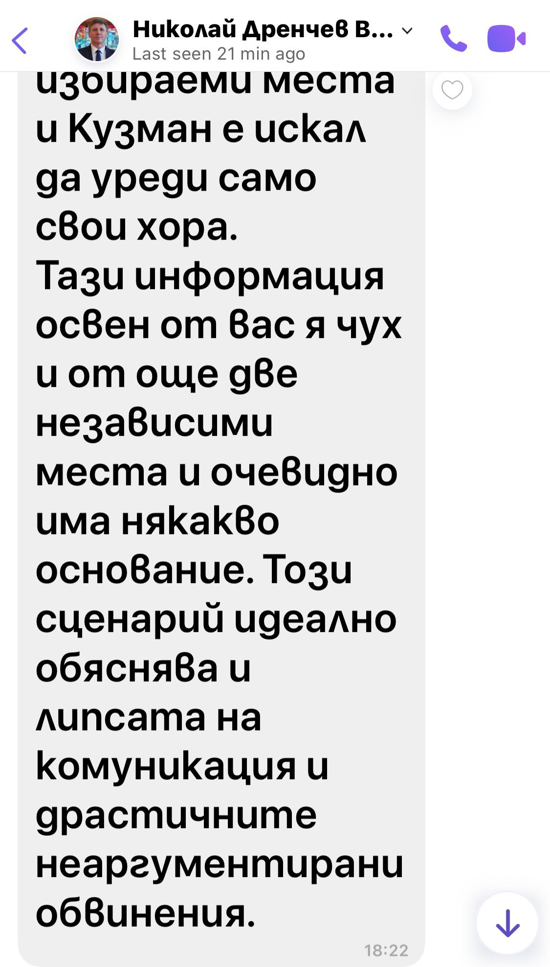"Потвърдиха ми вашата версия. Радев е казал на Кузман, че ще е мандатоносител. Вместо да обсъдят предложението с нас, те решиха да ни премахнат, не толкова защото щяхме да сме против, а защото за мандатоносителя са били обещани малко на брой избирателни места. Кузман е искал да уреди само свои хора.