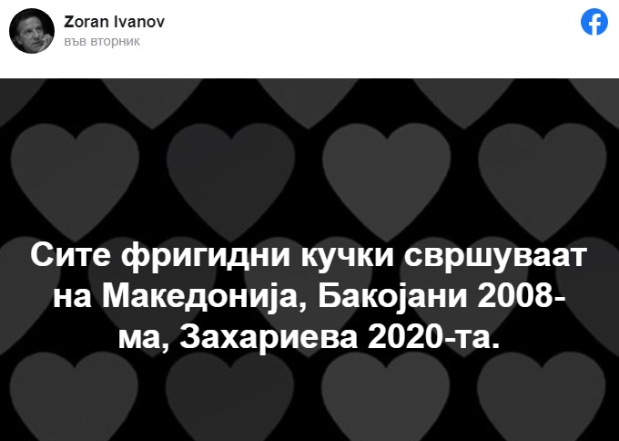 След решението на София - на 17 ноември във „Фейсбук“ Иванов написа, че българският външен министър Екатерина Захариева и бившата гръцка нейна колежка Дора Бакояни (б.р. не успява да постигне споразумение през 2008 г. в спора за името на Македония) са „фригидни кучки“, с което взриви социалната мрежа.