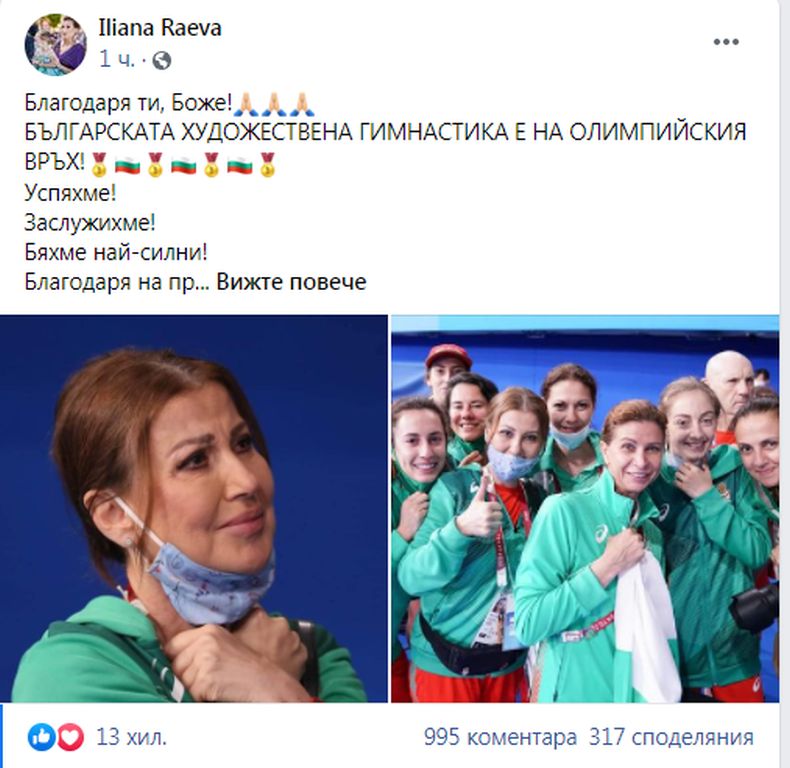 Изключително емоциоланел пост пусна Илиана Раева в профила си във "Фейсбук след златния медал за българските гимнастички. "Благодаря ти, Боже! БЪЛГАРСКАТА ХУДОЖЕСТВЕНА ГИМНАСТИКА Е НА ОЛИМПИЙСКИЯ ВРЪХ!