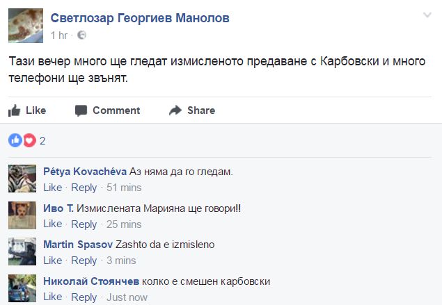 Тази вечер много ще гледат измисленото предаване с Карбовски и много телефони ще звънят. Това написа в профила си във Фейсбук Светлозар Манолов от Казанлък, който се прочу преди време, че е трезвеник, не пуши и си търси жена.