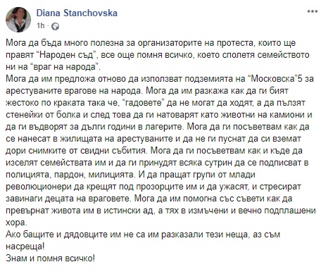 Мога да бъда много полезна за организаторите на протеста, които ще правят “Народен съд”, все още помня всичко, което сполетя семейството ни на “враг на народа”.