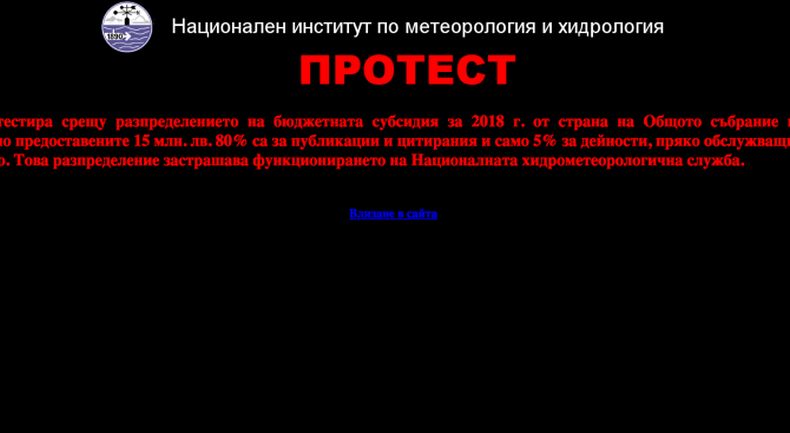 „НИМХ протестира срещу несправедливото разпределение на бюджетната субсидия за 2018 година от страна на Общото събрание на БАН, което застрашава функционирането на националната хидрометеорологична служба". Такова съобщение на черен екран посреща всеки, който иска да посети официалния сайт на НИМХ.