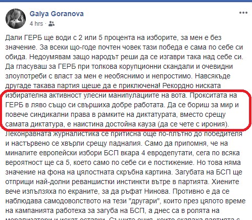 Подробности по скандалните интриги разкри във фейсбук Даниела Петкова, която е от екипа на Ваня Григорова. Синдикалистката в последния момент бе издигната от независим комитет и не успя да се пребори за място в европарламента.