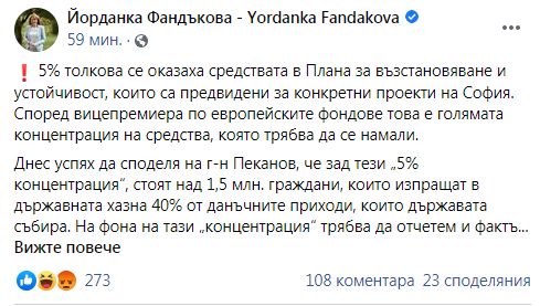 "5% толкова се оказаха средствата в Плана за възстановяване и устойчивост, които са предвидени за конкретни проекти на София. Според вицепремиера по европейските фондове това е голямата концентрация на средства, която трябва да се намали." Това написа на страницата си във "Фейсбук" кметът на София Йорданка Фандъкова, разкривайки, че хората на Румен Радев умишлено атакуват столичани.