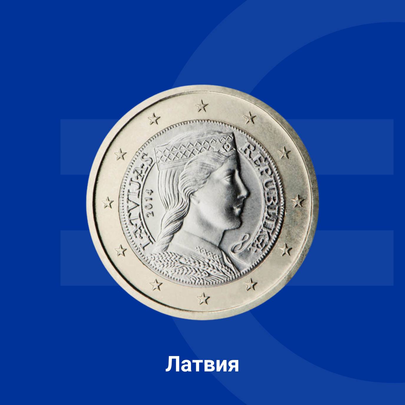 Националната страна на монетата от 1 евро в Латвия представлява момиче в народна носия. Изображението е използвано първоначално върху сребърната монета от 5 лата през 1929 г. Дизайнът е дело на Гунтарс Сиетинш.
