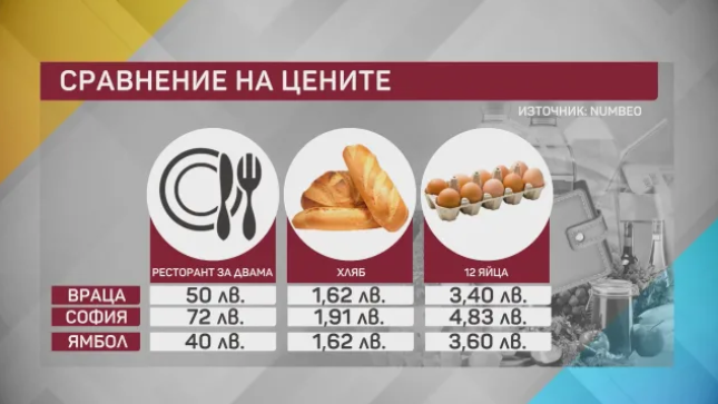 Разлика има не само в заплатите, а и в цените на регионално ниво. Според онлайн платформа вечеря за двама в ресторант във Враца например струва около 50 лв. В София – над 70 лв., а в Ямбол – около 40 лв.. Цената на хлябът в София е около 1,90 лв. ,а в другите два региона – 1,60 лв. 12 яйца в във Враца ще ни струват 3,40 лв., в София – близо 5 лв., а в Ямбол – 3,60 лв.
