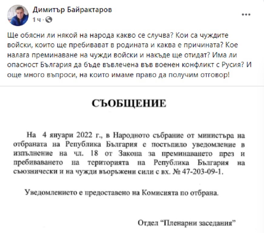 "Ще обясни ли някой на народа какво се случва? Кои са чуждите войски, които ще пребивават в родината и каква е причината? Кое налага преминаване на чужди войски и накъде ще отидат? Има ли опасност България да бъде въвлечена във военен конфликт с Русия? И още много въпроси, на които имаме право да получим отговор", написа журналистът Димитър Байрактаров.
