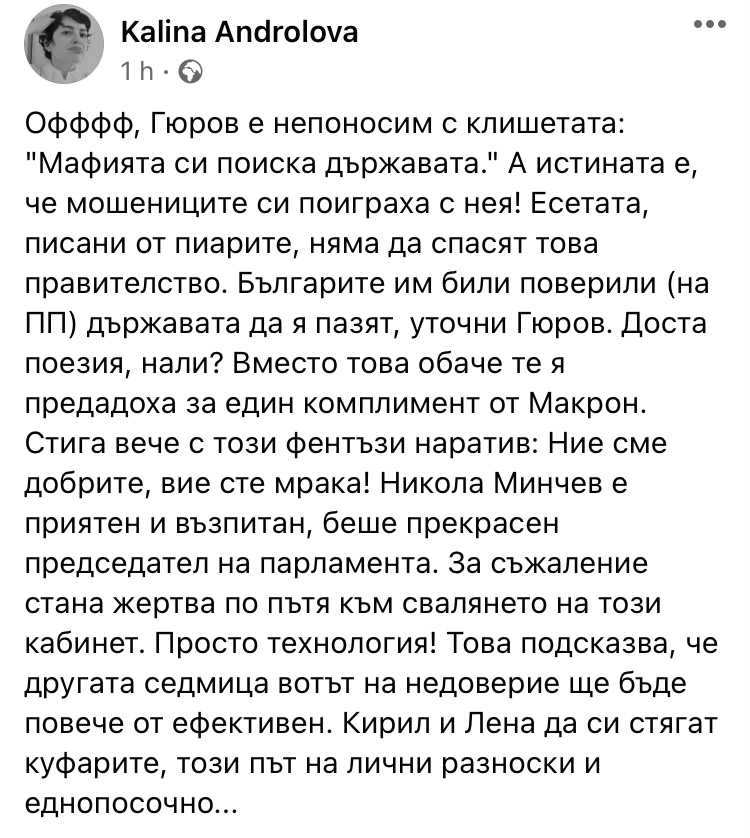 Офффф, Гюров е непоносим с клишетата: "Мафията си поиска държавата." А истината е, че мошениците си поиграха с нея! Есетата, писани от пиарите, няма да спасят това правителство. Българите им били поверили (на ПП) държавата да я пазят, уточни Гюров. Доста поезия, нали? Вместо това обаче те я предадоха за един комплимент от Макрон.