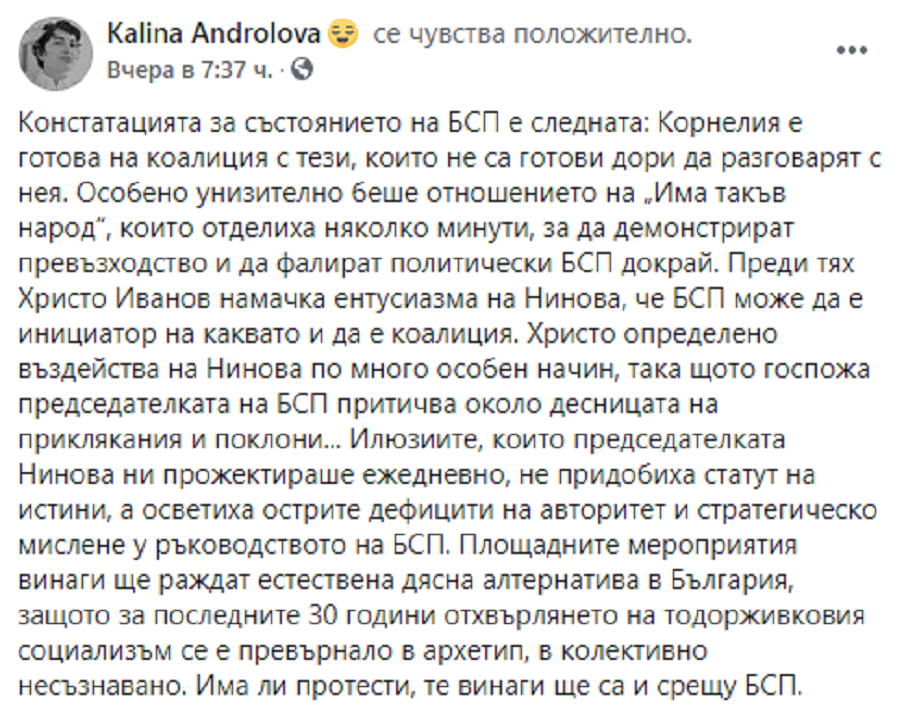 Ето и цялото мнение на Калина Андролова в социалната мрежа: