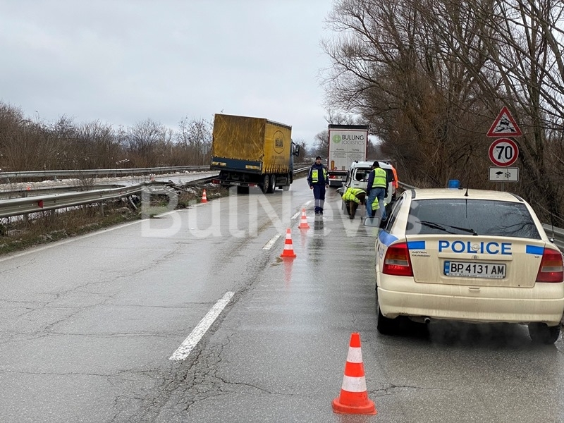 Инцидентът е станал днес следобед, малко след отбивката за железничарския град, в посока Враца. Служебният автомобил е бил спрял на пътното платно, при което идващият камион е тръгнал да я заобикаля и я е ударил странично. Тежкотоварното возило е повлякло леката кола, водачът загубил контрол над управлението и камионът се качил върху мантинелата.