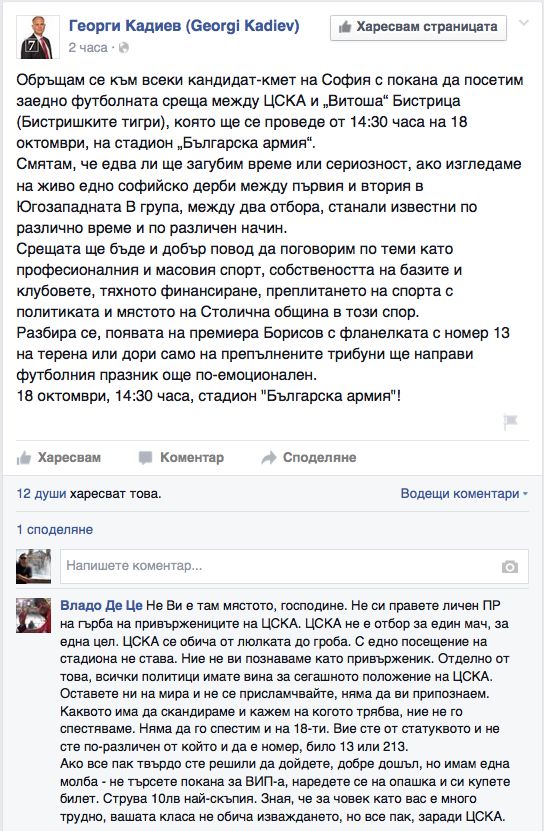 "Обръщам се към всеки кандидат-кмет на София с покана да посетим заедно футболната среща между ЦСКА и „Витоша“ Бистрица (Бистришките тигри), която ще се проведе от 14:30 часа на 18 октомври, на стадион „Българска армия“. Смятам, че едва ли ще загубим време или сериозност, ако изгледаме на живо едно софийско дерби между първия и втория в Югозападната В група, между два отбора, станали известни по различно време и по различен начин. Срещата ще бъде и добър повод да поговорим по теми като професионалния и масовия спорт, собствеността на базите и клубовете, тяхното финансиране, преплитането на спорта с политиката и мястото на Столична община в този спор. Разбира се, появата на премиера Борисов с фланелката с номер 13 на терена или дори само на препълнените трибуни ще направи футболния празник още по-емоционален. 18 октомври, 14:30 часа, стадион "Българска армия", пише Кадиев.