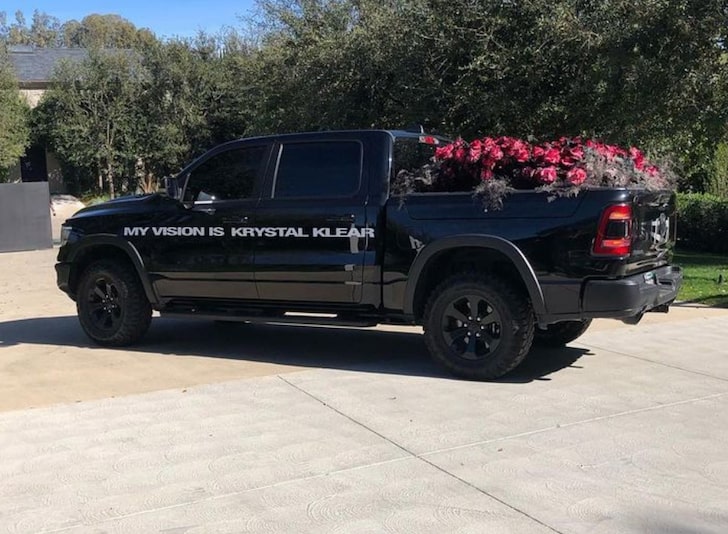 "Намеренията ми са кристално ясни", гласи надписът на превозното средство, с което той достави цветята директно до дома на най-известното попълнение от клана Кардашиян.